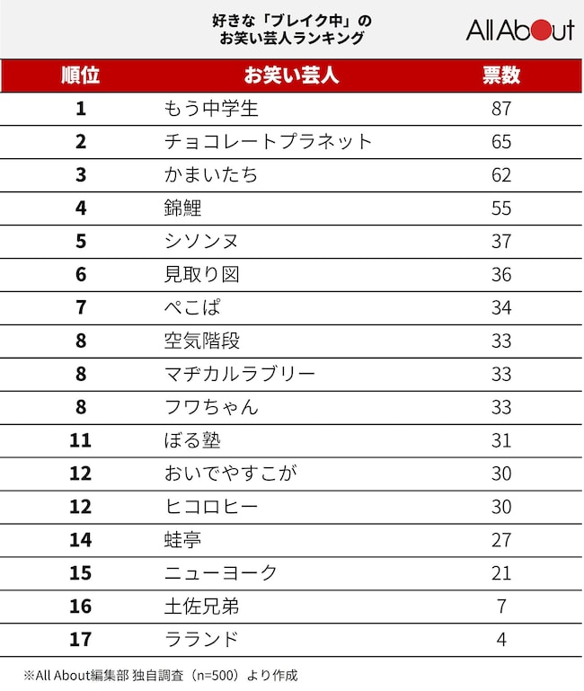 旬のブレイク芸人たちの人気ランキング! 全国に住む10~60代の男女500人に対してアンケート調査を実施しました。果たして1位になったのは?