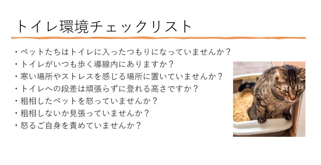続いては、排せつ時のトラブルに対するケア。これには、ペットが排せつしやすい環境づくりがポイントとなるそうです。ペットのトイレ問題は、飼い主にとって大きな負担ですが、失敗したことを叱ればペットのストレスにつながります。そのため、「トイレの環境と共に、飼い主さんの気持ちをやさしく整えることも大切」なのだそう。