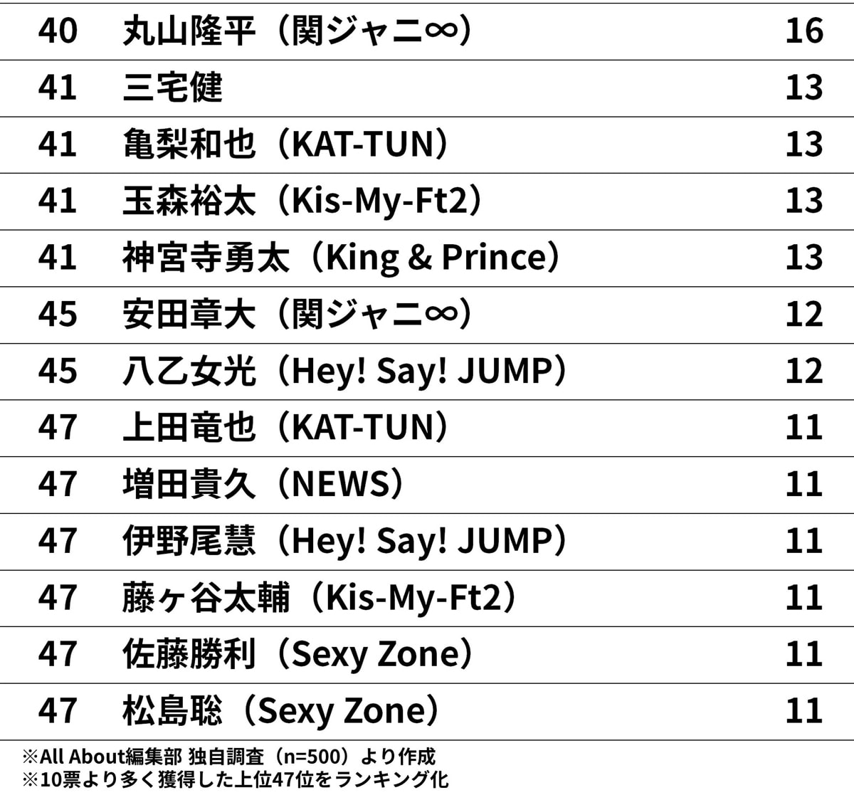 All About編集部は2月13~23日に、全国10~60代の500人を対象に「ジャニーズタレント」に関するアンケート調査を実施。「絶対に退所しないでほしいジャニーズタレント」ランキングで1位に選ばれたのは?